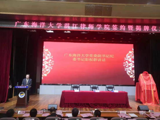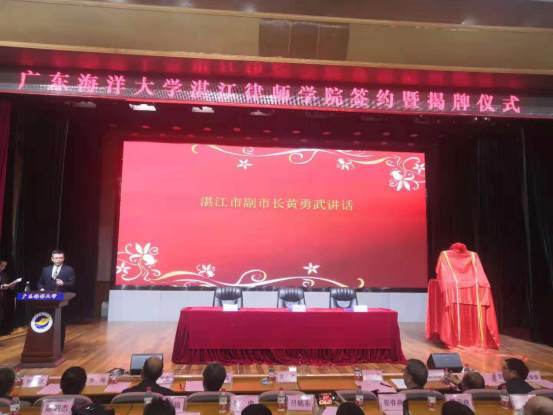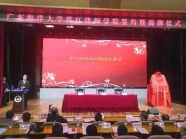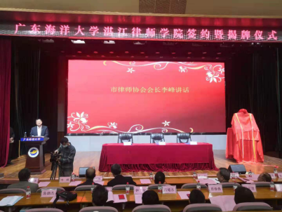 事业发展的市委市政府、市司法局、市律师协会等各级政府部门和社会各界表示衷心感谢;在致辞中表示,成立湛江律师学院是学校加强与地方、司法行政、律师行业合作,服务司法行政工作、律师队伍建设工作的重要体现,是学校助力法治建设实践、创新法治人才培养的大胆探索;学校将大力支持律师学院的建设和发展,努力提供必要的条件保障,希望湛江律师学院努力培育一支讲政治、护正义、精业务、为人民的湛江律师队伍;希望市司法局、市律师协会与广东海洋大学优势互补,进行全方位的深度合作,以建设全省一流律师学院为发展目标,为依法行政、律师行业发展等提供更多成果和经验,为建设法治广东、法治湛江做出新贡献。