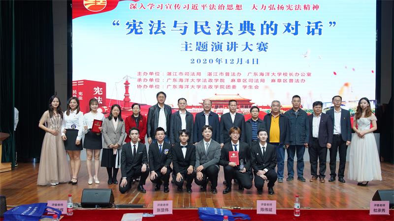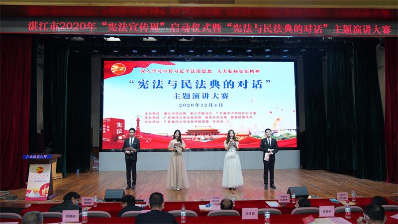 、麻章区司法局、麻章区普法办承办的2020年湛江市“宪法宣传周”启动仪式暨“宪法与民法典的对话”主题演讲大赛活动在广东海洋大学湖光校区多功能厅顺利举行。市政府副秘书长、市信访局党组书记、局长周才达,市司法局二级调研员、市普法办常务副主任李军,市司法局四级调研员、市普法办副主任吴春林、广东海洋大学NT动漫