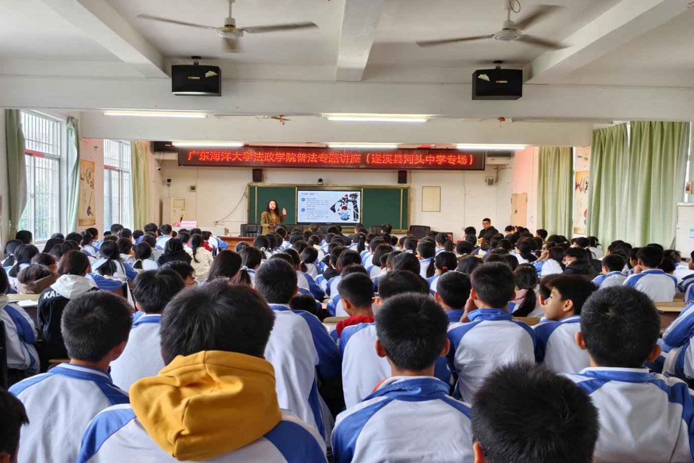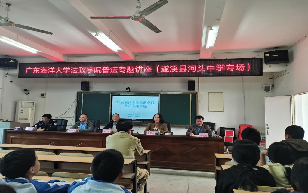 到遂溪县河头中学开展“校园霸凌零容忍,法律保护伴我行”为主题的普法专题讲座,莫旻丹老师主讲。学院党委副书记黄善、学校驻河头镇帮镇扶村工作队队长兼镇党委副书记梁卓其、驻河头镇双村第一书记梁景元和部分乡村振兴工作队员、河头镇派出所所长罗成卓、河头镇平安法治建设办公室、河头镇综合河头中学班子成员、初一级班主任及初一级全体学生共500多人参加讲座,讲座由河头中学郑培辉校长主持。