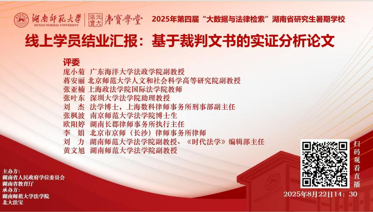 2025年8月,湖南师范大学法学院与北大法宝联合举办第四届“大数据与法律检索”湖南省研究生暑期学校。该项目是教育部产学合作协同育人项目“新闻科课程《大数据与法律检索》师资培训”的内容之一。该项目以丰富多元的课程体系和专家云集的师资阵容,每年都吸引自海内外两百余所高校的研究生近千人报名,直播观看总人次超过二十万,连续两年被评为北大法宝学堂最受高校和学生欢迎的系列课第一名。