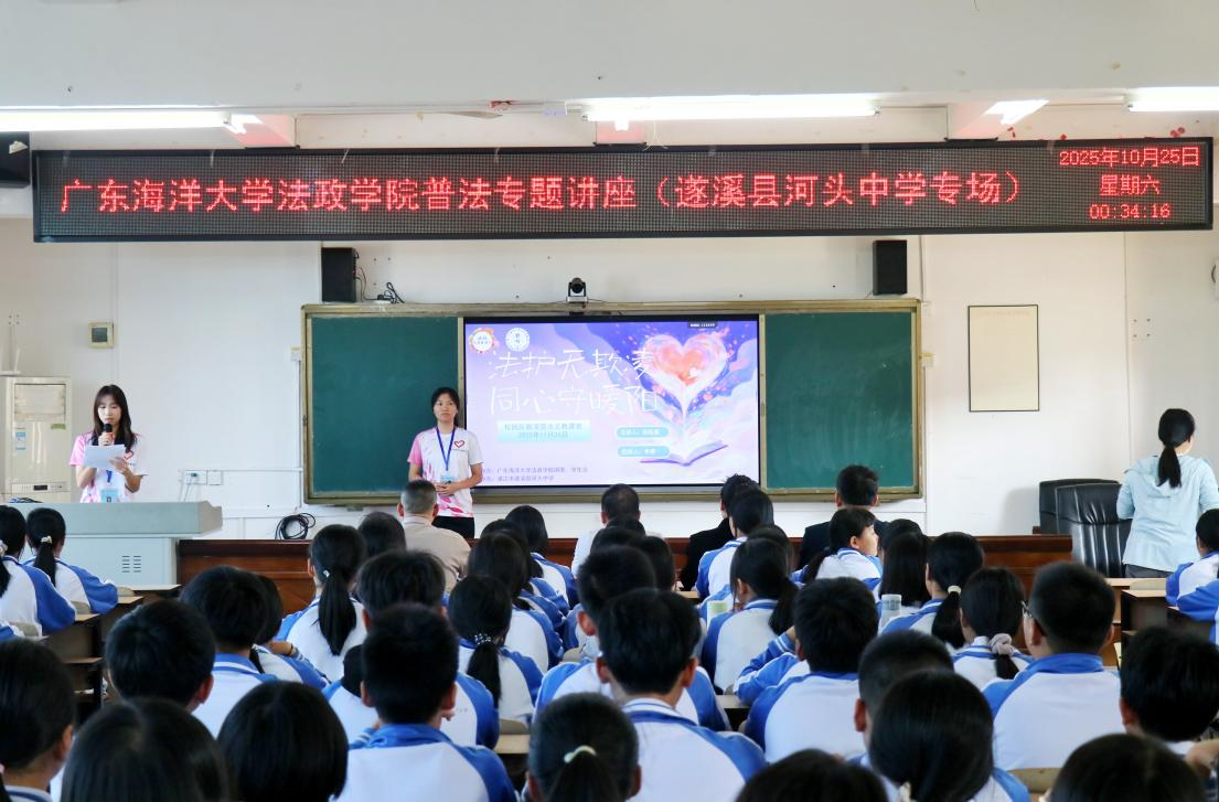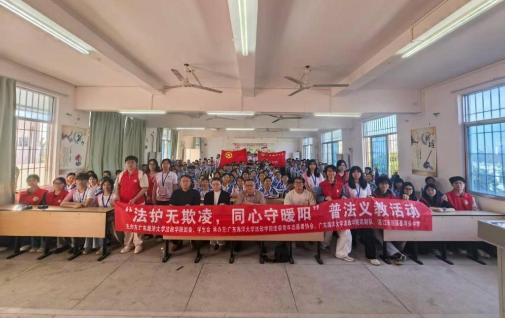 乡村振兴路,普法护航行。为助力遂溪县河头镇乡村振兴进程,发挥“一学院一乡村”党建帮扶重要作用,提升乡村中学生法治素养。2025年11月26日,学院团委、学生会联合青年志愿者协会、话剧队等单位,赴湛江市遂溪县河头中学开展“法护无欺凌,同心守暖阳”校园反欺凌普法义教活动。广东海洋大学驻河头镇帮镇扶村工作队队长兼镇委副书记梁卓其、NT动漫